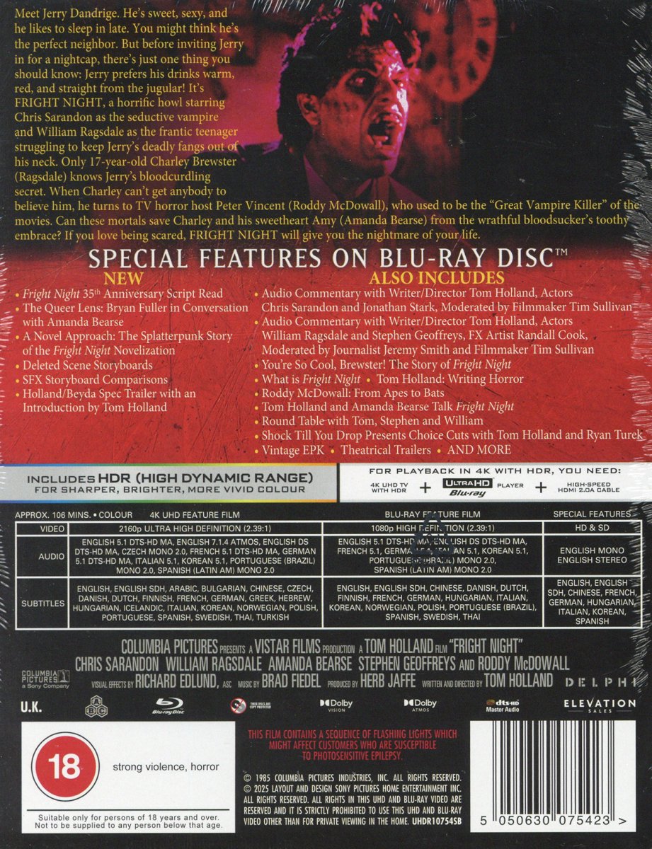 '80s US horror written and directed by Tom Holland. When young horror fan Charley Brewster (William Ragsdale) discovers his next-door neighbour Jerry (Chris Sarandon) is a vampire, his mother, his friends and the police just think he's been watching too many horror films. In fact, the only person he can convince of his fears is the host of the horror TV show "Fright Night", Peter Vincent (Roddy McDowall). Thrown together under these strange circumstances, Charley and Peter team up to confront the bloodsucker.